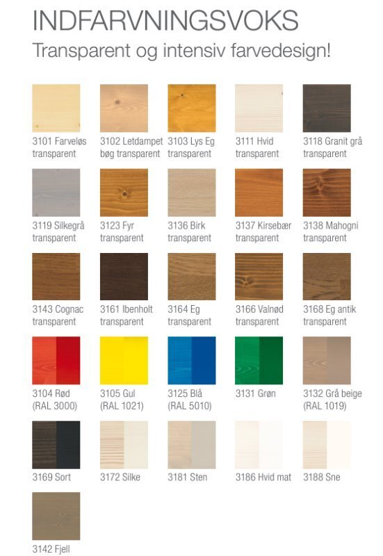 Transparent eller intensiv Infärgningsvax, som kombinerar alla fördelar med olja och vax i en produkt. Synlig trästruktur bevaras. Osmo Indfarvningsvoks är vatten- och smutsavvisande och ger en slitstark och naturtrogen yta. Jämfört med traditionella produkter ger de naturliga vegetabiliska oljorna en jämn färg och ett harmoniskt utseende. Lätt att använda - utan grundning och mellanslipning - sparar tid och pengar. Användbar för trä: mikroporös yta som inte spricker eller flagnar. Motståndskraftig mot vin, öl, cola, kaffe, te, juice, mjölk och vatten enligt DIN 68861-1A - inga kalkfläckar. Efter torkning avger produkten inga ämnen som är skadliga för människor, djur eller växter (motståndskraftig mot saliv och svett enligt DIN 53160, lämplig för leksaker enligt EN 71.3).